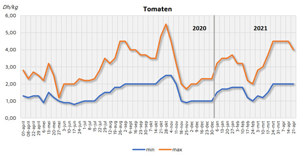 This is an overview of weekly prices for the most traded fruit and vegetables. That's on Morocco's Casablanca market. It indicated the minimum and maximum price in Moroccan dirhams/kg.