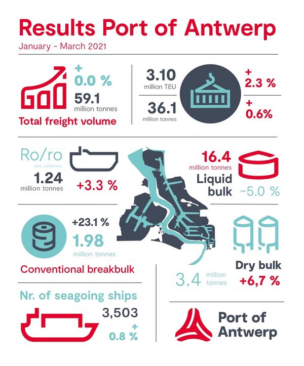 The total throughput of Port of Antwerp remained stable at 59,1 million metric tonnes compared with the same period last year. Despite the impact of the ongoing coronavirus crisis and Brexit, all goods flows except liquid bulk recorded growth. For the coming period, it remains to be seen what the impact will be of the incident in the Suez Canal. Port of Antwerp anticipates busy terminals where possible.