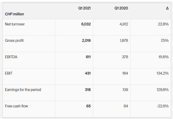 Kuehne+Nagel's start to the 2021 business year was marked by a strong demand in transport services, especially for pharma and e-commerce fulfilment. Kuehne+Nagel achieved an excellent result in this environment: net turnover of over CHF 6.0 billion, EBIT of CHF 431 million and earnings for the period of CHF 318 million were all significantly higher year-on-year.