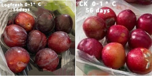 Plums kept at 0-1℃ and 90% humidity for 56 days with Logfresh preservation technology (left) and without (right)