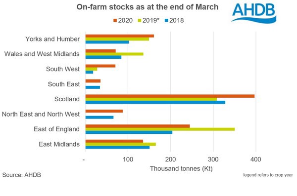 A partial reason for the higher stocks in Scotland, is a lack of seed sales, as over 70% of 2020 GB seed area was grown in Scotland. With domestic seed sales said to be slow earlier in the year, combined with an export ban to the EU since 1 January 2021, it is likely to add to higher stocks.