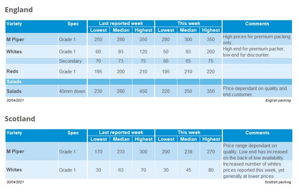 - Agria is still very sought after and prices have continued to climb this week, particularly for the top quality samples. As previously mentioned, this is generally driven by supply confidence rather than the demand picture. The low end of the market represents material that has internal issues and bruising.
