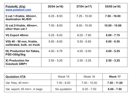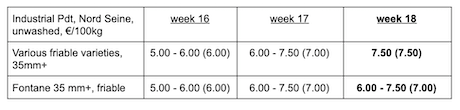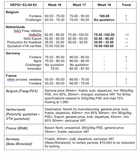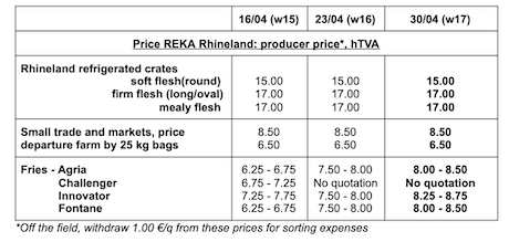 Bintje and Challenger: no quotation (although there are transactions!) due to the wide variation in prices depending on use, quality and the buyer.