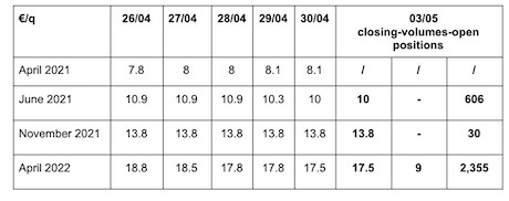 Average price free market for the week ending on April 27th, 2021: 15.26 £/q (17.30 £/q the previous week), +/- 17.55 €/q. Prices have decreased, especially because the varieties quoted were more basic last week than the previous week.