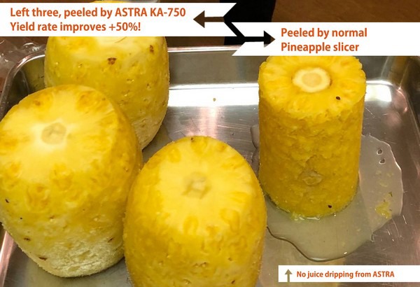 ASTRA is one of the very few companies who can manufacture peeling machines using this technology. “Peeling seems a simple performance, but it is the combination and balance of many elements such as the material of the blade (the metal used for pineapple blades can only be produced in Japan), the shape of the peeler, the way it touches the fruit and the way it moves and speed control, etc. - all these factors play a role, and interact with each other. The technological improvement behind the blade peeler is more than a simple change of the form of the blade.”