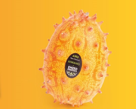 The fruit has a different name outside New Zealand. "Kiwano is a registered trademark. It may only be sold under that name by the rightful grower in New Zealand. And his partners, as resellers," says Peter. Outside of New Zealand, this fruit is called a horned melon. The Kiwano fruit is from a plant in the cucumber family. It originated in the Kalahari Desert in Africa. It's green/orange to completely orange. It has jelly-like green, tangy flesh and edible seeds.