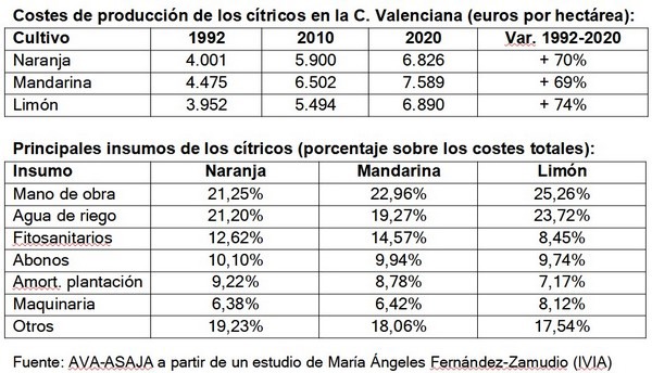 The Valencian Association of Farmers (AVA-ASAJA) stated that according to data from the 'The Valencian citrus industry, the evolution of its production costs and inputs' study published by Maria Angeles Fernandez-Zamudio of the Valencian Research Institute Agrarias (IVIA) the production costs of citrus fruits in the Valencian Community have increased by 70% during the last 30 years (1992-2020).
