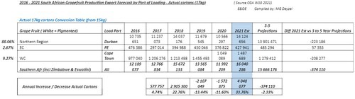 The recent industry figures released states that in 2020 +/- 11,992 million 17kg cartons (actual ) were exported. The current estimate for 2021 stands at +/-16 million, but the prediction for the next 3-5 years shows a potential decrease of about 377,000 cartons.