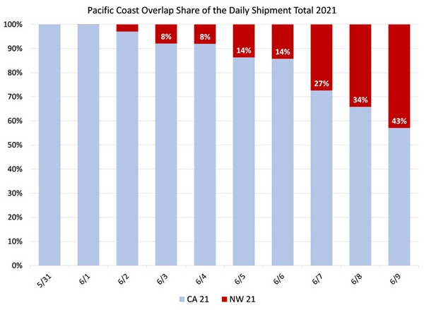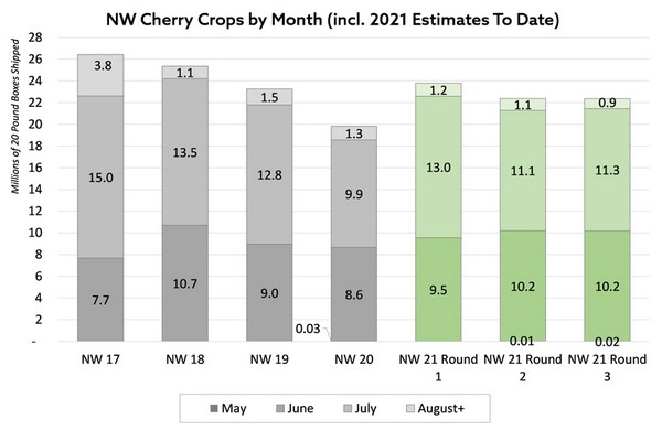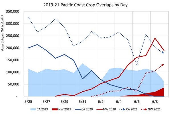 The chart below gives a 2 year overview of the Pacific coast cherry crop, as well as the Northwest's Round 3 estimate projected as a crop curve. (Click to enlarge) As evidenced by the dark red line of 2021's actual shipments, the pace of harvest has slowed since the date of estimate, but the general distribution of volume continues to track along with the estimate. With a slower start, that will also push a few more cherry boxes into July's total.