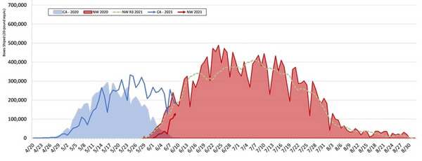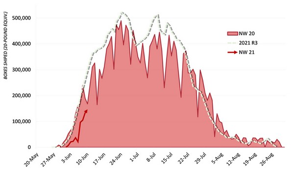 Harvest is well under way in the Northwest, and soon the shelves will be filled with the sweet 2021 crop. As detailed in our last report, the end of May brought cool and unsettled weather which delayed the first pick for many of our early growers. Similar weather patterns have largely continued to be the case as harvest slowly spreads and picks up speed in other spots across the Northwest. Atypical storm fronts and lower daytime temperatures have caused growers to delay picking in order to allow their fruit to reach optimal maturity before harvest, which has led to an overall slower start to harvest and limited initial volumes. To date, our industry has shipped just under 600,000 boxes total, much less than forecasted before the cooler weather.