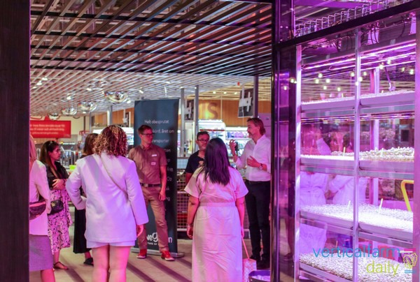 It was all laughs and surprised faces during the opening at the ICA Maxi supermarket in Linköping this week. The opening event of the in-store vertical farm, a service provided and managed by Swedish technology company Swegreen, gained lots of traction from surprised and sometimes confused shoppers. Andreas opened the event by giving a toast to invitees. After explaining the concept, the crowd was allowed a visit to the farm.