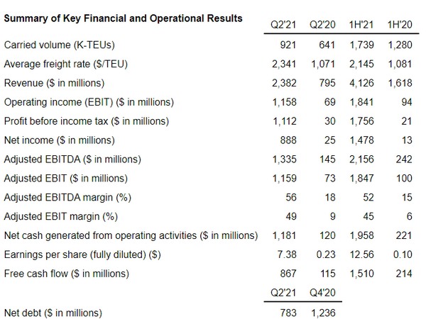 Total revenues were $2.38 billion for the second quarter of 2021, compared to $795 million for the second quarter of 2020, primarily driven by an increase in revenues from containerized cargo, reflecting increases in freight rates as well as in carried volume.