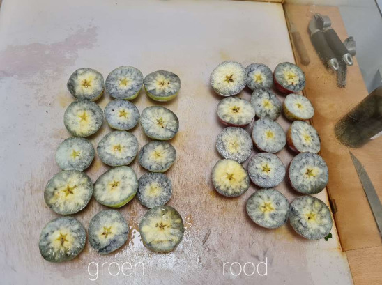 Jonagold apples starch test, 9-14-2021. On the left, the green apples, and on the right, the red apples. These all come off the trees.