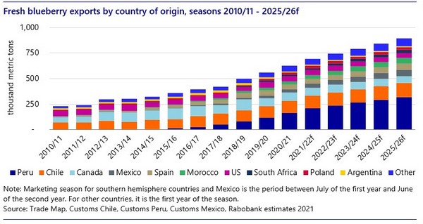 Global blueberry export volume has grown at a compound annual growth rate (CAGR) of about 11% during the recent decade. International shipments and availability have exploded in the last decade, fuelled by the rising production of new actors in the industry, such as Peru, Mexico, Morocco, South Africa, and China, which complements the existing supply from the US, Chile, Argentina, and local supply from Europe. Since the 2019/20 season, Peru has become the largest global fresh blueberry exporter, and Chile is now the second-largest global exporter of blueberries.