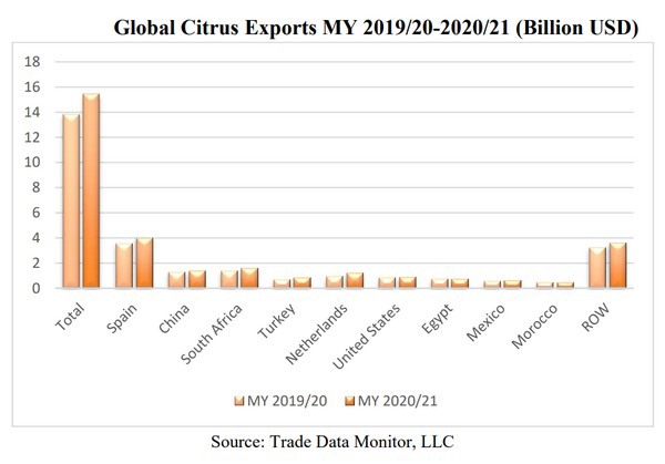 In MY 2021/22, EU citrus production is projected to drop 6.8 percent compared to the previous season to 10.7 MMT due to unfavorable weather conditions in the top EU citrus-producing countries. Expected reductions in domestic supplies, higher demand for citrus derived from the COVID-19 pandemic, and the reopening of the hospitality sector may encourage EU citrus imports.