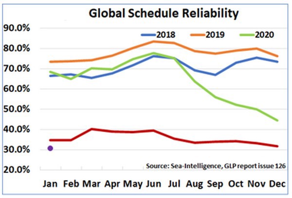 MSC and HMM had schedule reliability between 30%-40%, with six carriers recording schedule reliability of 20%-30%.