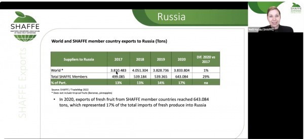 As for Russia, she said that, in 2020, fresh fruit exports from SHAFFE member countries reached 643,084 tons, accounting for 17% of all fresh produce imports into Russia.