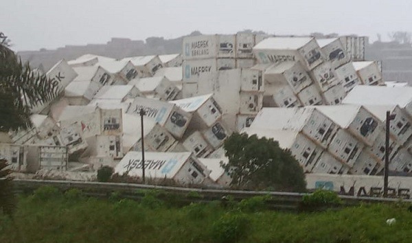 The N2 freeway is blocked by empty containers. Empty containers are jumbled together as bottom containers shifted in rising water levels and the stacks collapsed.