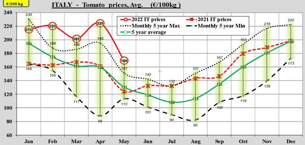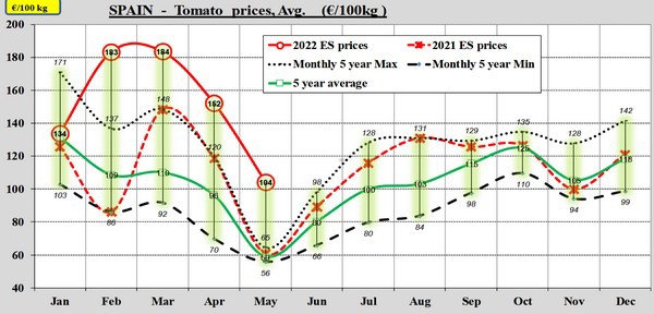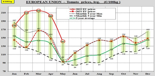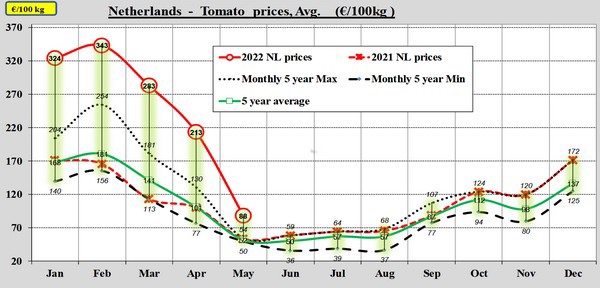As expected, tomato prices continued to drop in May. Nevertheless, the prices are still above average. In the Netherlands, the prices decreased more than average. In Spain, however, prices fell slightly less. A new update of the European Commission's tomato dashboard shows that in both countries, a kilogram of tomatoes yielded less than the European average.