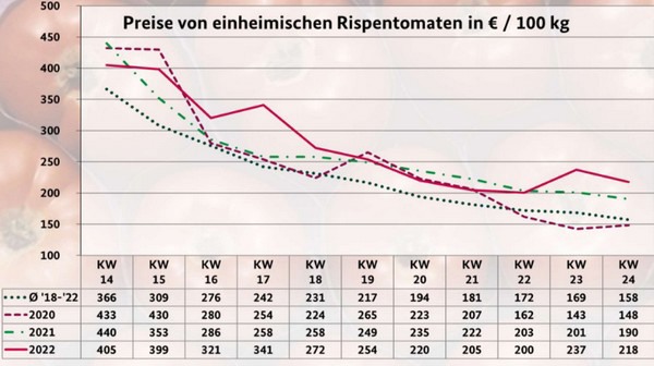 Also, on the German wholesale markets, the price is well above the five-year average, according to a BLE report. Around weeks 17 and 18, a decline can be seen here, but it is followed by a price recovery. In the case of German tomatoes, the prices, after coming slightly closer to the five-year average in May, actually rose again in June.