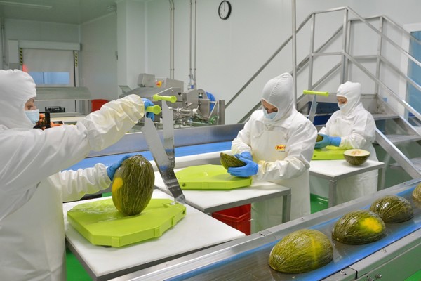 Food safety is one of the most sensitive and important aspects for the company both in the work of melon and watermelon halves and in the production of any of its IV range products. That's why the process is carried out in a clean room, a 400 m² space where workers handle the product following the appropriate methods, sanitized utensils, and work surfaces. This room is maintained at an ambient temperature that does not exceed 8 degrees and its air is constantly renewed by microfiltration.