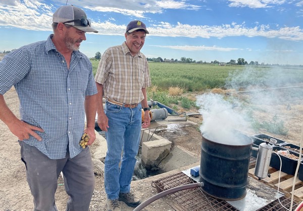 The new research involves subjecting three potato varieties — Clearwater, Alturas and Russet Burbank — to smoke emitted from pine needles, sage brush and wood. Burnt in a commercial smoker attached to a mixing drum, the blend attempts to emulate wildfire smoke. The smoke is piped to potato plots, where plastic covers trap smoke in with plants, while other control potato plants grow in a smoke-free environment to let researchers compare outcomes. Daily potato smoke treatment at the U of I Parma Research and Extension Center began July 11 and ended Aug. 18.