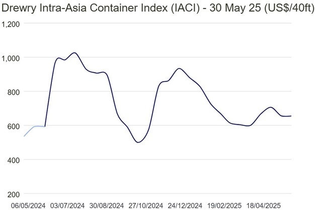 Drewry's Intra-Asia Container Index (IACI) remained stable in the second half of May, registering a marginal decline of just $1 to settle at $655 per 40-foot container. Despite this minor dip, some of the underlying route-specific indices saw double-digit fluctuations, reflecting ongoing variability within individual trade lanes.