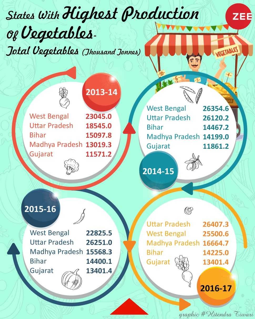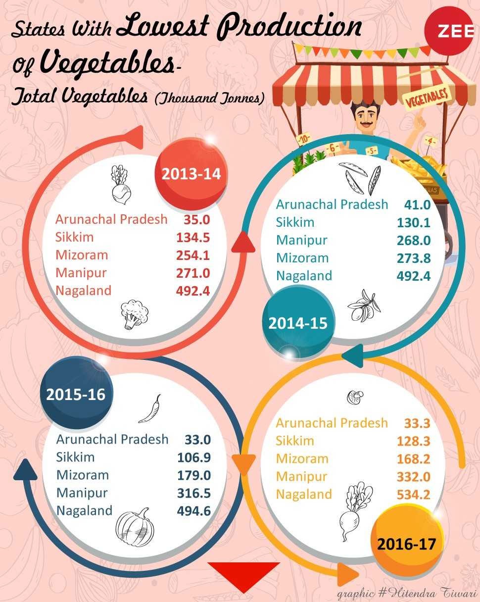 In the last four years, West Bengal topped the chart for the States with Highest Production Of Vegetables (Thousand Tonnes) from in 2013-14 to 2016-17. While for the same period Arunachal Pradesh stood at the bottom of the chart.