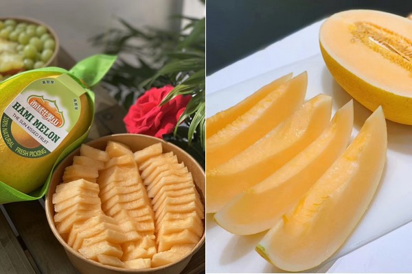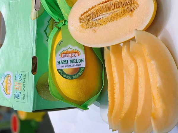"Korla Western Mountain of Flowers and Fruit mainly sells 'Hongguan xiangfeimi' muskmelons. This muskmelon variety is shaped like an egg and the outside is bright yellow all over. The flavor is both sweet and fresh. This muskmelon has the typical flavor of Hami melons. That is why this variety is so popular with Chinese consumers.