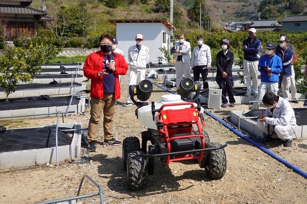 As an all-electric, mini-scale autonomous farm robot, the R150 travelled nimbly between three rows of Sun Fuji apples, spraying atomised pollen solution uniformly on every tree from the bottom up. From a distance, the operator could adjust the spray angle and spread width simply through the smartphone app.