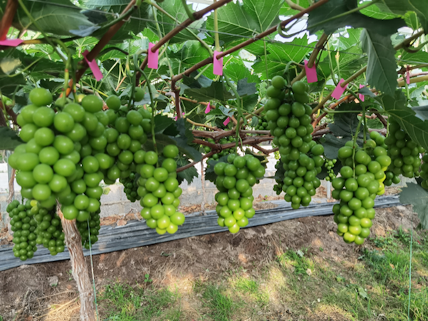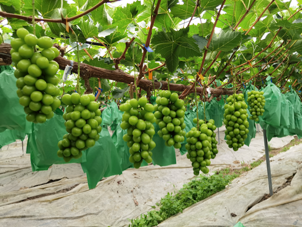 In terms of facilities, the vineyard makes use of large tunnels covered in clear plastic with irrigation lines and automatic fertilizer systems that reduce the need for manual labor. The systems distribute organic fertilizer and maximize the efficiency of fertilizer. The tunnels also feature equipment to lower the temperature and adjust humidity levels to optimum conditions for the sensitive Shine Muscat grapes. In addition, our plantation is operated on the principle of ecological diversity. The grapes co-exist with other organisms and they are covered with protective pouches to avoid plant diseases and insect pests. Finally, average precipitation in Xichang is too much for Shine Muscat grapes, so the plastic tunnels help reduce the amount of water that the grapes receive."