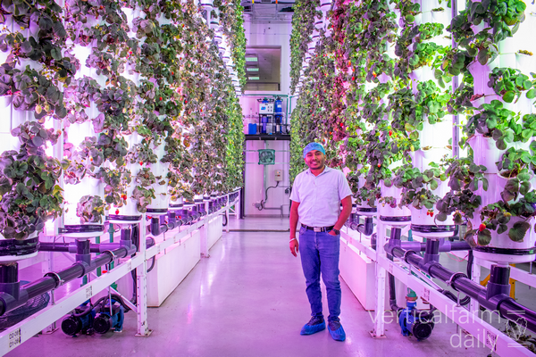 Aerovertica is an Indian agtech that supplies rotating growing towers and has two pilot farms in Dubai. The strawberry farm we visited has a total cultivation area of 200m2, whereas another farm based in Dubai as well counts a total cultivation area of 1600m2, which cultivates strawberries and edible flowers.