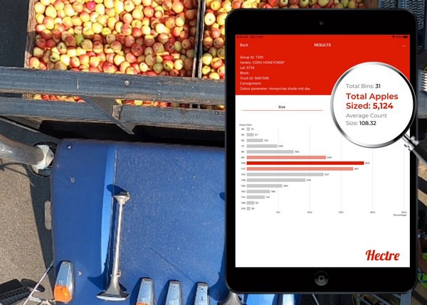 Hectre’s Spectre hand-held fruit sizing app detects and sizes more than 100 pieces of fruit per bin from a simple photo on a standard iPad. Size results are available within seconds. The mobility and simplicity mean the app can be used in the orchard as soon as the fruit is picked, or in the packhouse, providing massive increases in reliable size data to better inform the pick, the pack, freight, and sales.