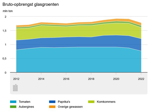 At 1.8 million tons, the gross greenhouse vegetable yields in the Netherlands were 7.9% lower in 2022 than a year before.