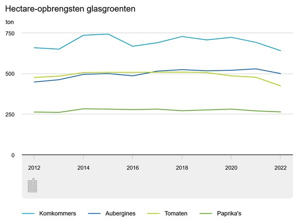 The gross yield of greenhouse vegetables in the Netherlands fell 7.9% to 1.8 million tons in 2022 compared to a year earlier. CBS figures show that for almost all vegetable crops cultivated in greenhouses, yields per hectare decreased, especially those of tomatoes (-12.5%) and cucumbers (-9.1%). This decline is mainly related to high energy prices. Gross eggplant yields, however, rose.