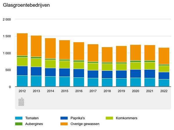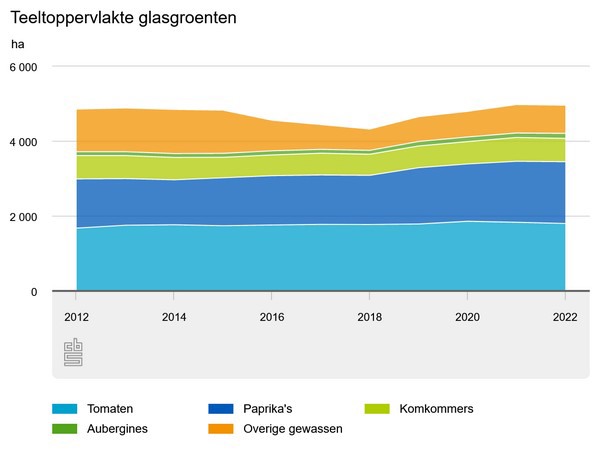 With an acreage of roughly 5,000 hectares in 2022, greenhouse vegetable acreage is the same size as in 2021. That is 2.1% more than in 2012. That area has increased since then, especially for bell pepper and eggplant cultivation, both approximately 26%. At 7.3%, tomato greenhouse cultivation acreage grew less.
