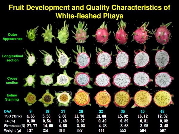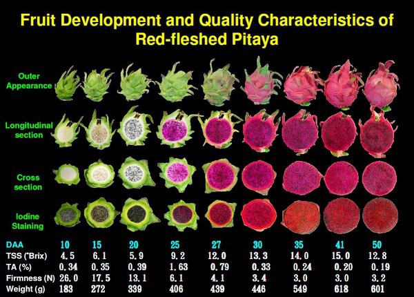 Achieving desired outcomes also requires managing harvest ripeness, Vietez says. “The intensity of the red color in the peel may be used to gauge harvest ripeness, which is measured by the Days After Anthesis (DAA) period. The ideal brix values for white-fleshed dragon fruit are between 13 and 15, which corresponds to a 32–36 DAA harvest window. For red-fleshed types, brix values between 12 and 13 indicate a harvest window of 27 to 30 DAA. Under-ripeness is indicated by harvesting below the advised DAA levels, while over-ripeness is indicated by harvesting above.”