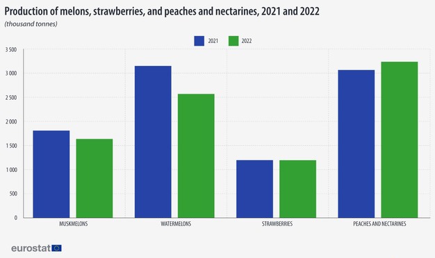 In 2022, the EU’s combined harvested production of muskmelons, watermelons, strawberries, peaches and nectarines was 8.6 million tonnes, representing a decrease of 6.3% on the level in 2021 (9.2 million tonnes). This downturn was due to the lower harvested production of muskmelons (-9.5% in 2022) and watermelons (18.4% in 2022). Indeed, the production of peaches and nectarines increased (+5.6% in 2022), and that of strawberries remained relatively unchanged.