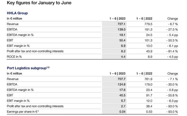 Hamburger Hafen und Logistik AG (HHLA) recorded a drop in revenue and earnings in the first half of 2023. The ongoing war in Ukraine, geopolitical tension, inflation and rising interest rates put pressure on consumer and industrial demand and are continuing to hinder the global economic recovery in the aftermath of the pandemic.