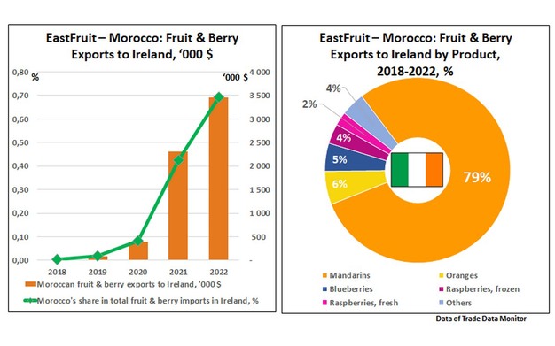 For example, the Moroccan fruit and berry exports to Ireland had been minimal but started growing actively in 2020. As a result, in 2018-2022, the export revenues from the Moroccan exports to Ireland grew 244 times and reached almost $3.5 mln in 2022.