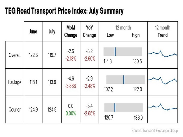 New data from the TEG Road Transport Price Index reveals that road transport prices fell 2.13% during July, with haulage prices dropping just under 4%.