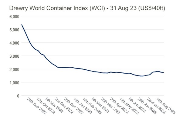 Drewry's assessment for Thursday, 31 August 2023 stated that the composite index has decreased by 1.6% to $1,739.59 this week, and has dropped by 69.3% when compared with the same week last year.