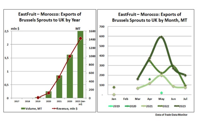 Since then, imports of Moroccan vegetables into the country have been growing and volumes of supplies have demonstrated a new record every year. Thus, in just three years, the amount of Brussels sprouts brought to Britain from Morocco increased by 10 times. The volume of supplies in 2023 reached 1,600 thousand tons, which brought Morocco $2.2 mln of export revenue. Note that for 2023, data from January to July are taken into account, and since Moroccan Brussels sprouts are exported during this period, respectively, in the current year, the export season is over.
