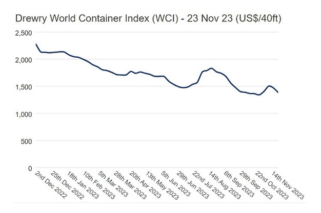 The latest Drewry WCI composite index of $1,384 per 40-foot container is now 3% less than average 2019 (pre-pandemic) rates of $1,420. The average composite index for the year-to-date is $1,688 per 40ft container, which is $986 lower than the 10-year average rate of $2,674 (which was inflated by the exceptional 2020-22 Covid period).
