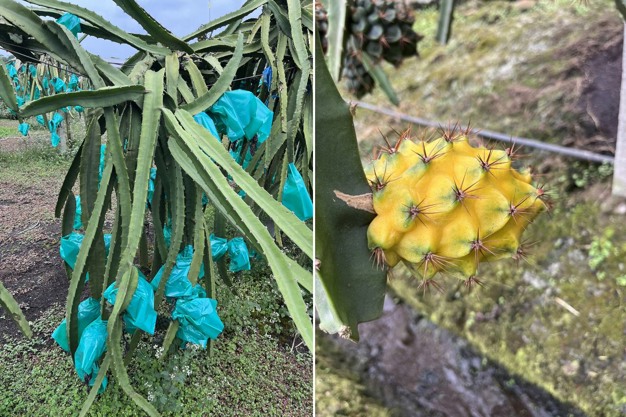 Left: Farmers using plastic bags for protection on the fruits. Right: Yellow dragon fruit from Palora.