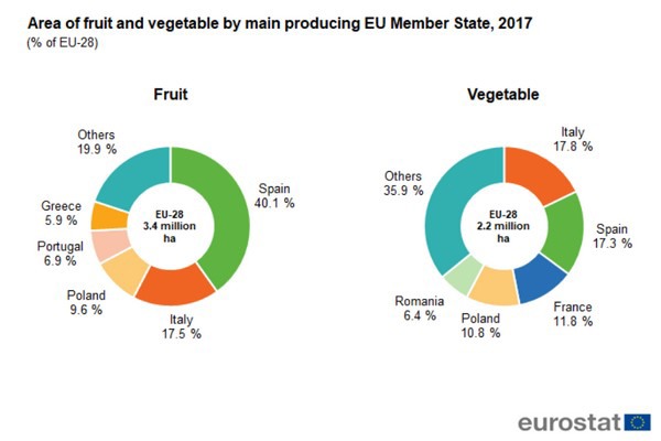 Spain accounted for by far the highest proportion (40.1 %) of area within the EU devoted to fruit production in 2017, reflecting its production of nuts and citrus fruit. Italy accounted for the next highest share (17.5 %), followed by Poland (9.6 %).