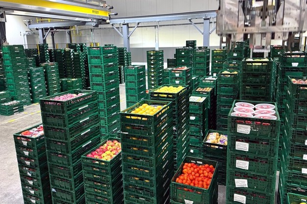 Crates of fresh produce can weigh up to 20 kilos. Lorries are packed 2 meters high, and loading 20 kg crates to that height often presents a challenge for human workers; logistics technology helps to make their jobs easier.