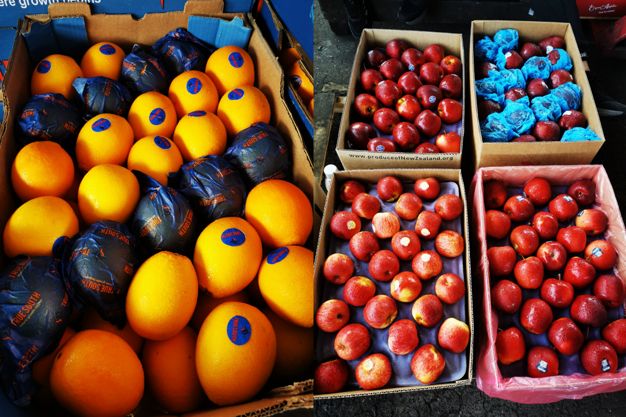 Left: South African Cambria oranges; Right: New Zealand apples.
