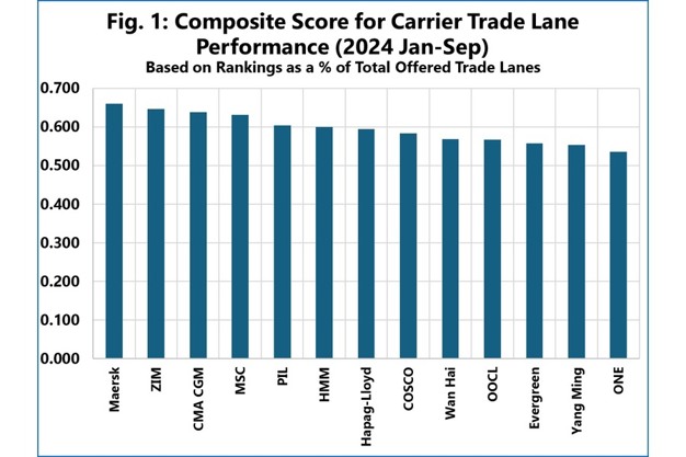 To quantify this for Jan-Sep 2024, we developed a composite score. For each global carrier, we calculated the percentage of times they ranked 1st, 2nd, 3rd, etc., on a trade lane. Every time they ranked 1st, they were assigned a score of 1.0, every time they ranked 2nd, they were assigned a score of 0.9, and so on, until a score of 0.1, which was assigned every time they ranked 10th on a trade lane. These scores were then added up, with the result shown in Figure 1.