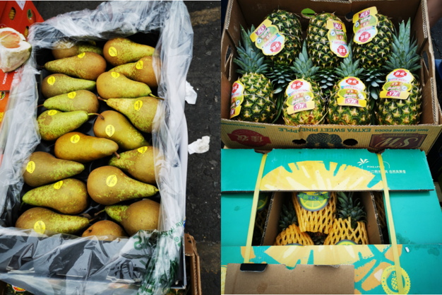 Left: Belgium Conference pears; Right: imported golden pineapples and domestic pineapples